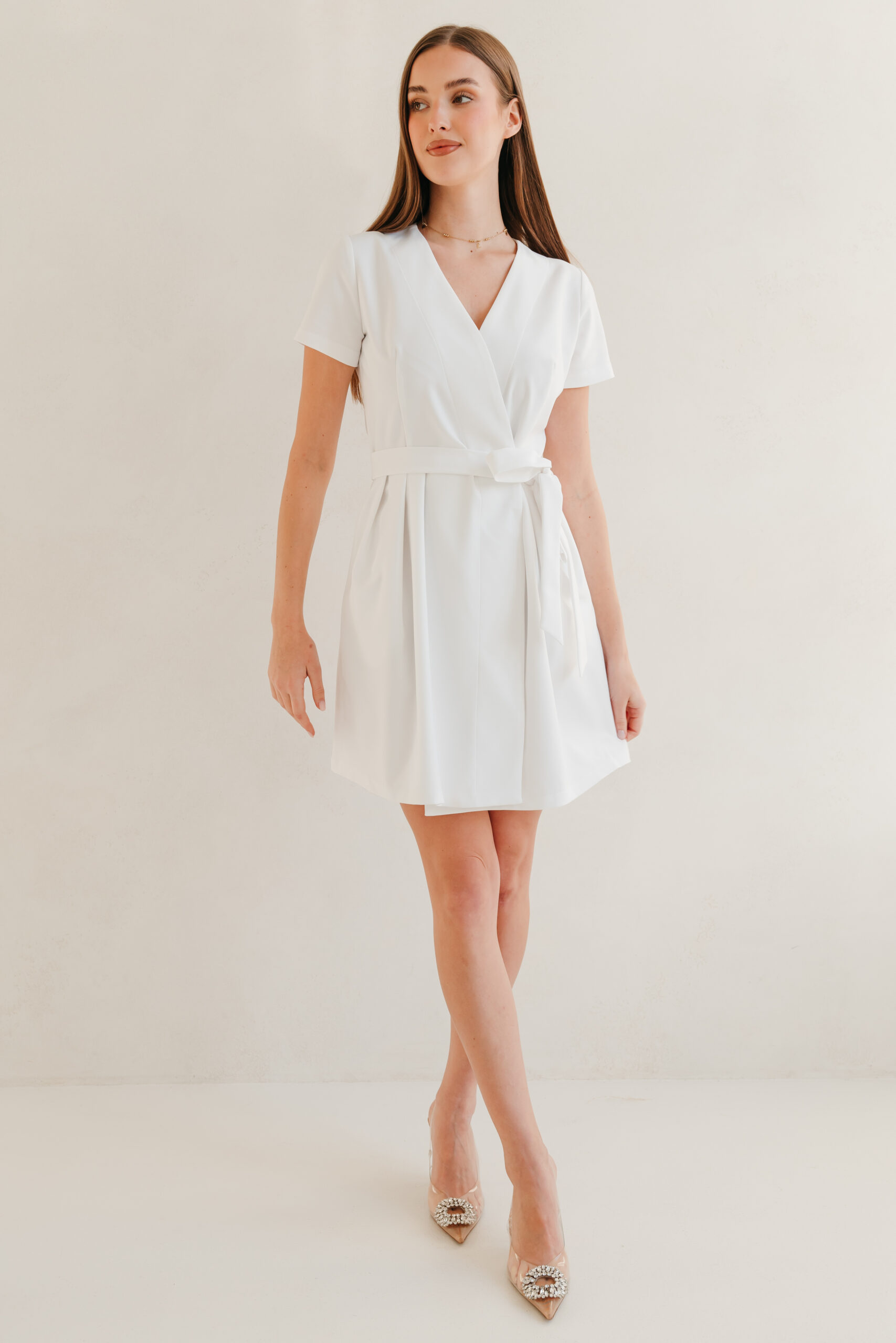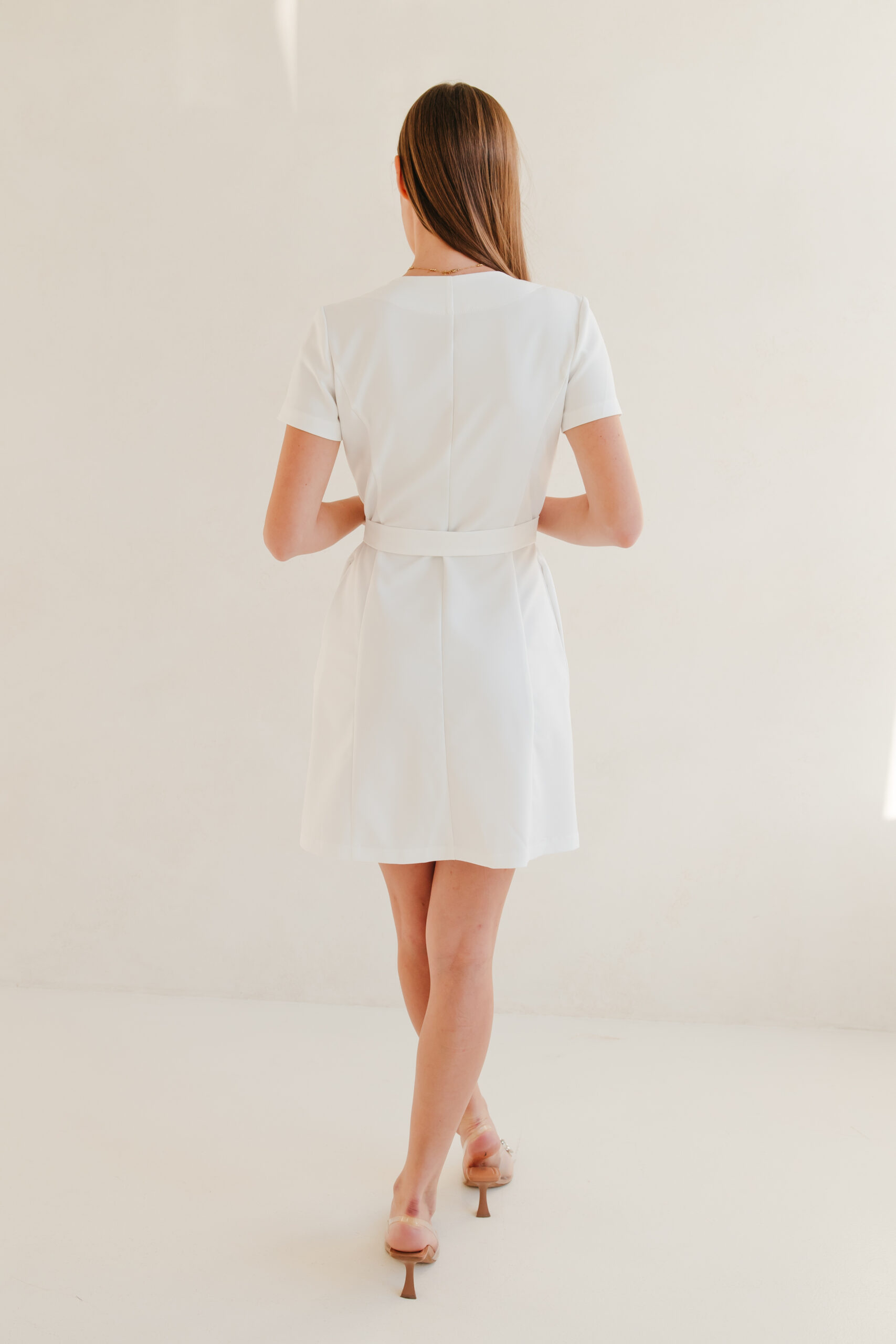 Niezwykle elegancki i kobiecy uniform. Posiada dwie niewidoczne kieszenie, które są ukryte w szwie. Dzięki funkcji wiązania w pasie można idealnie dopasować go do sylwetki.To kopertowy krój,który zapinany jest w talii na zatrzaski.Posiada proste rękawy i pięknie układający się dół . Jest to najbardziej elegancka wersja uniformu.